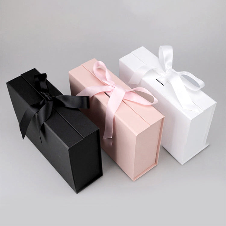 This luxury gift box is made from hard grey board and coated paper, offering a foldable design with magnetic closure and ribbon accessory. It features bio-degradable and recyclable properties, suitable for various gift and craft uses.